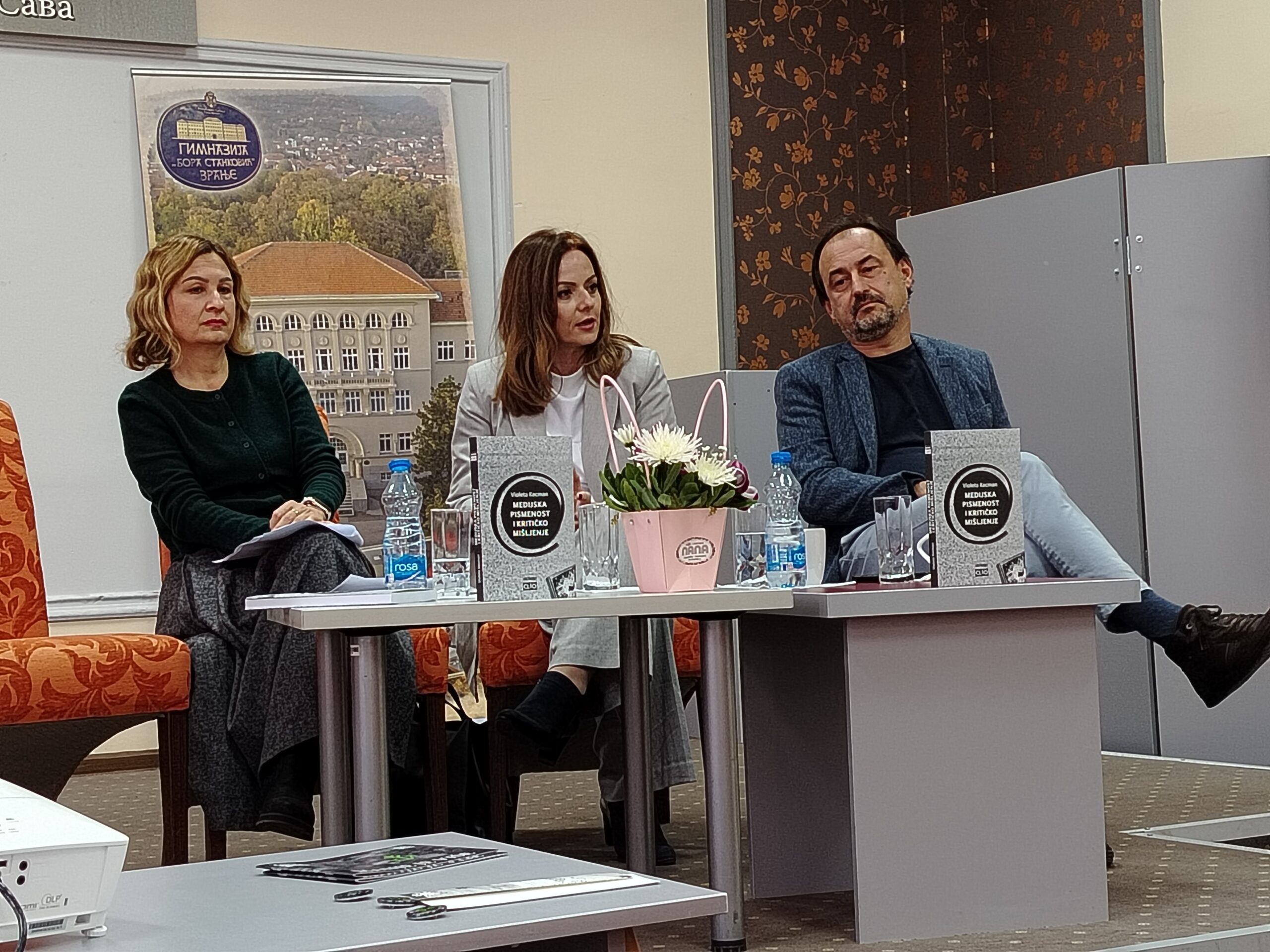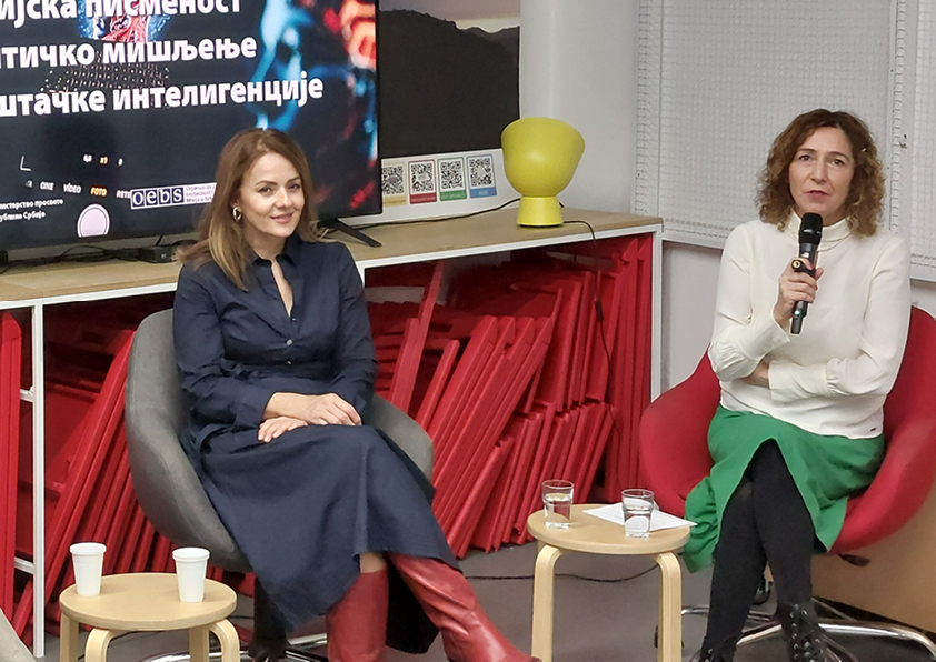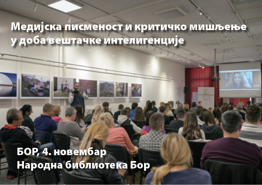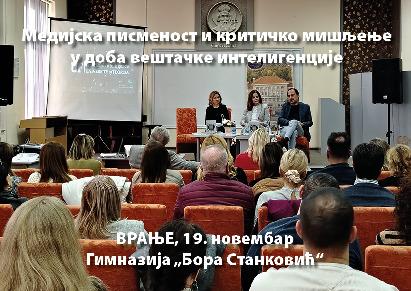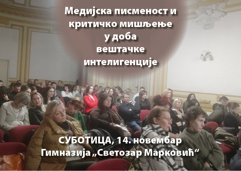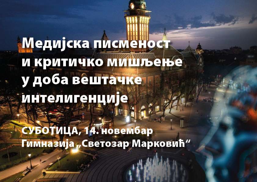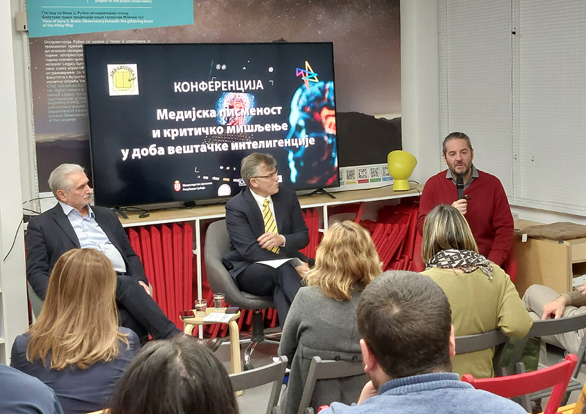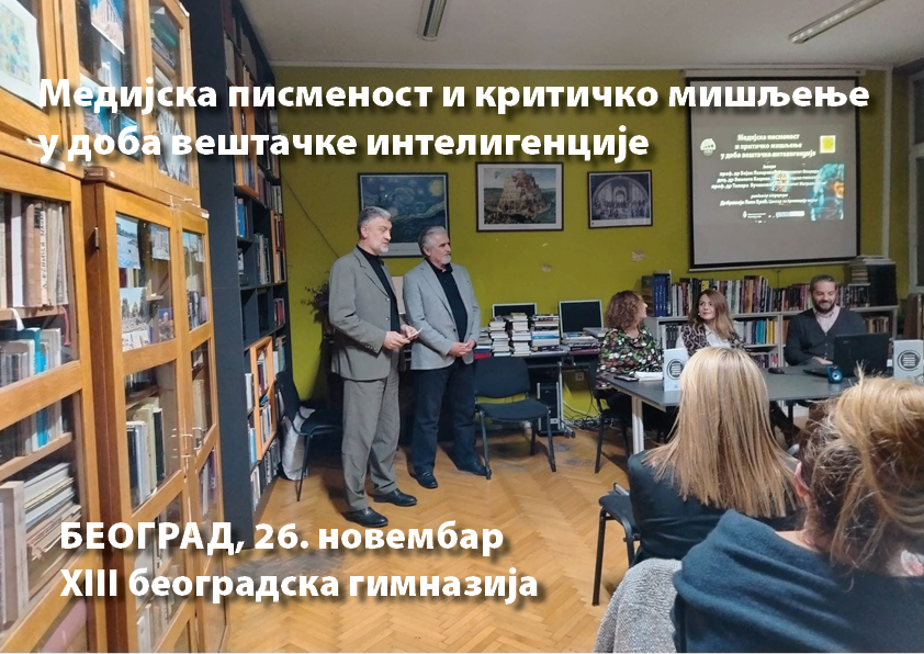 Трибина „Медијска писменост и критичко мишљење у доба вештачке интелигенције“, одржана у XIII београдској гимназији, била је подељена у два тематска дела. У првом делу разматрана су питања мишљења, писмености и интелигенције, са посебним освртом на природну и вештачку интелигенцију, њихове разлике и сличности. Бојан Лазаревић је представио тему „Шта јесте, а шта није AI“ уз видео презентацију, док је Виолета Кецман говорила о вештинама медијске писмености у контексту вештачке интелигенције, истичући важност аналитичког и критичког приступа дигиталним медијима. Тамара Вученовић је анализирала улогу технологије и дигиталне културе у савременом друштву, указујући на њен утицај на медијске садржаје и друштвене односе. Дискусија је обухватила питања етике у прикупљању и коришћењу података, регулације AI на глобалном и националном нивоу, као и све већу доминацију технолошких компанија. Завршна разматрања фокусирала су се на антропооптимизам као перспективу за сагледавање AI и њеног утицаја на друштво.