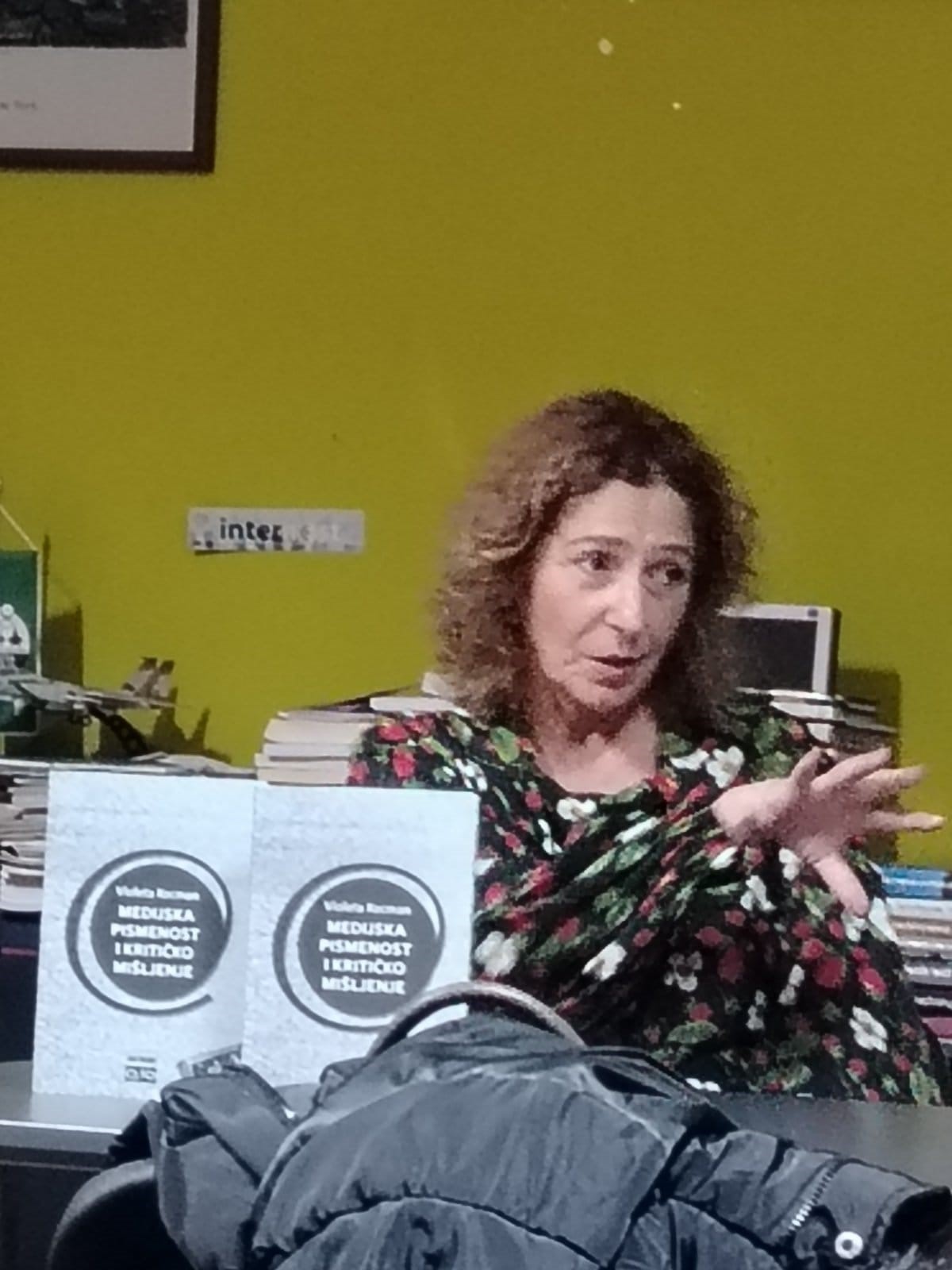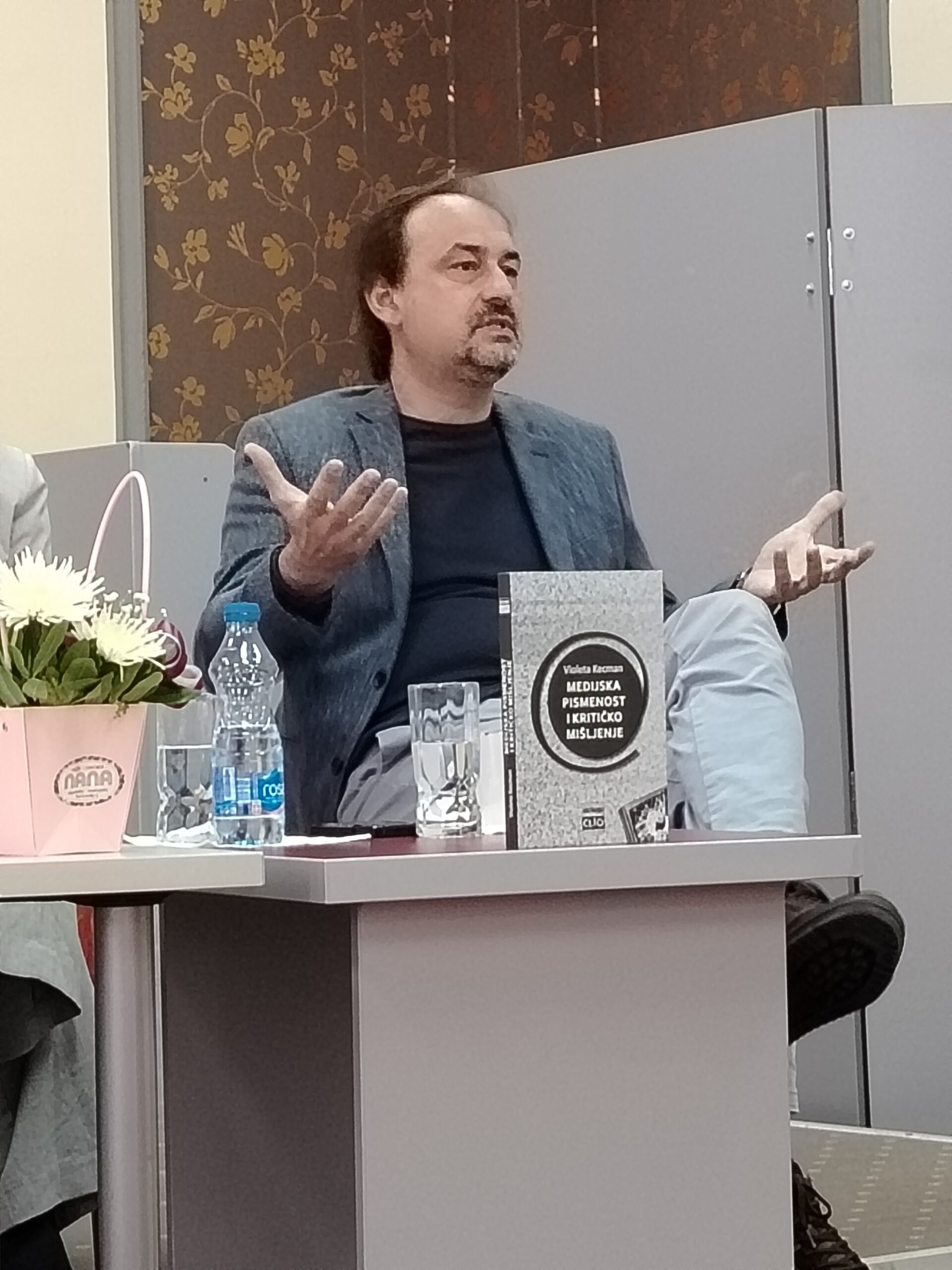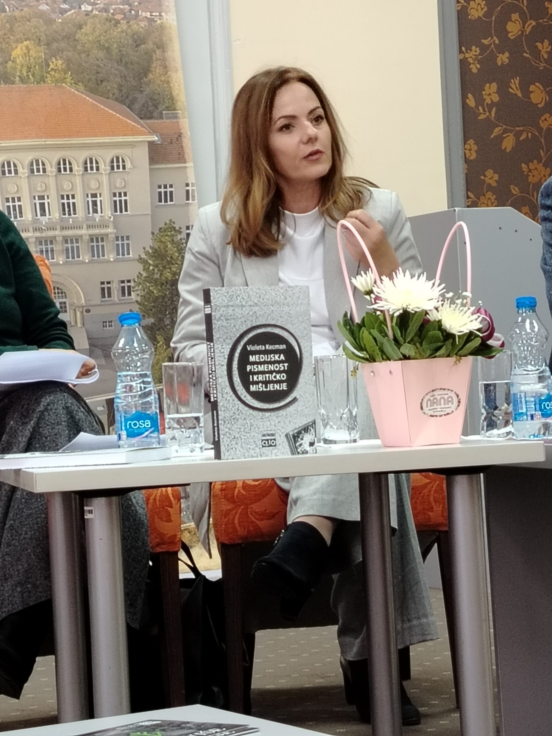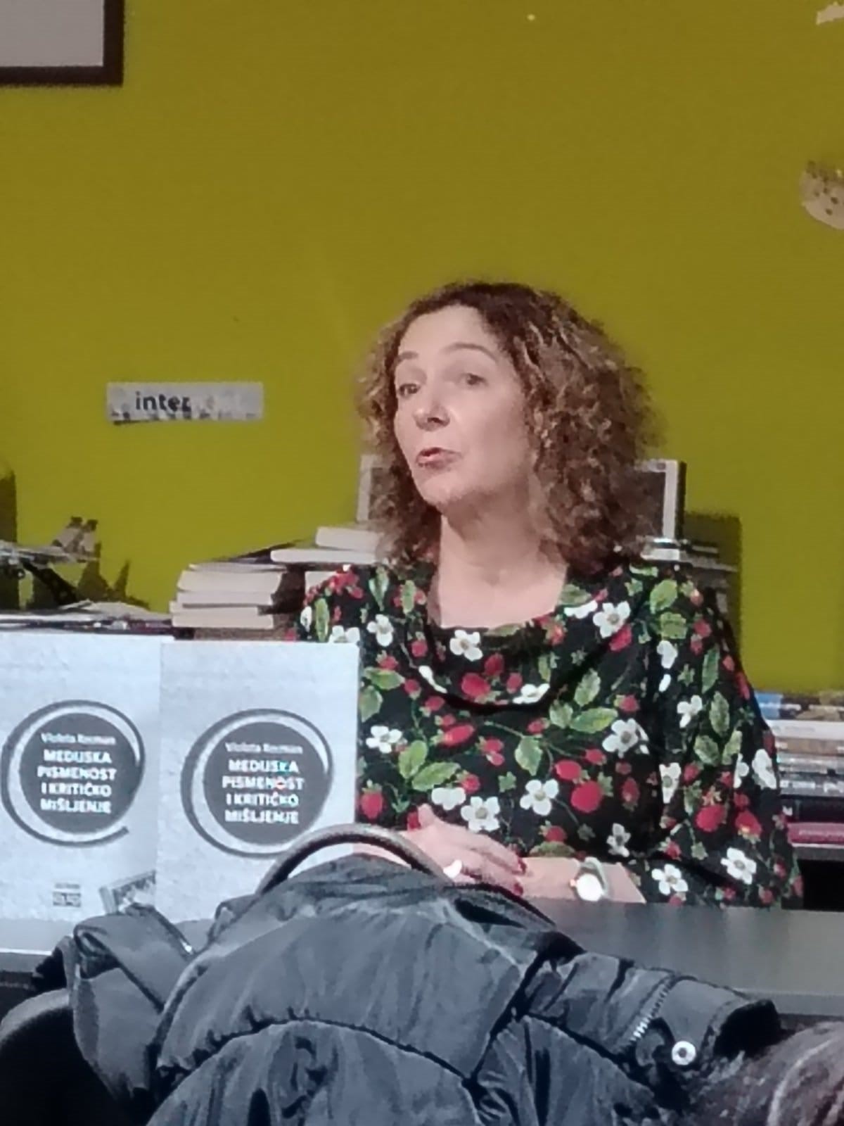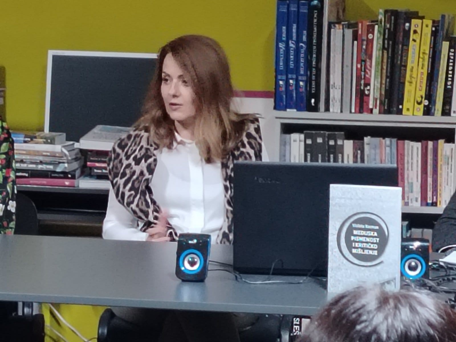 Трибина „Медијска писменост и критичко мишљење у доба вештачке интелигенције“, одржана у XIII београдској гимназији, била је подељена у два тематска дела. У првом делу разматрана су питања мишљења, писмености и интелигенције, са посебним освртом на природну и вештачку интелигенцију, њихове разлике и сличности. Бојан Лазаревић је представио тему „Шта јесте, а шта није AI“ уз видео презентацију, док је Виолета Кецман говорила о вештинама медијске писмености у контексту вештачке интелигенције, истичући важност аналитичког и критичког приступа дигиталним медијима. Тамара Вученовић је анализирала улогу технологије и дигиталне културе у савременом друштву, указујући на њен утицај на медијске садржаје и друштвене односе. Дискусија је обухватила питања етике у прикупљању и коришћењу података, регулације AI на глобалном и националном нивоу, као и све већу доминацију технолошких компанија. Завршна разматрања фокусирала су се на антропооптимизам као перспективу за сагледавање AI и њеног утицаја на друштво.