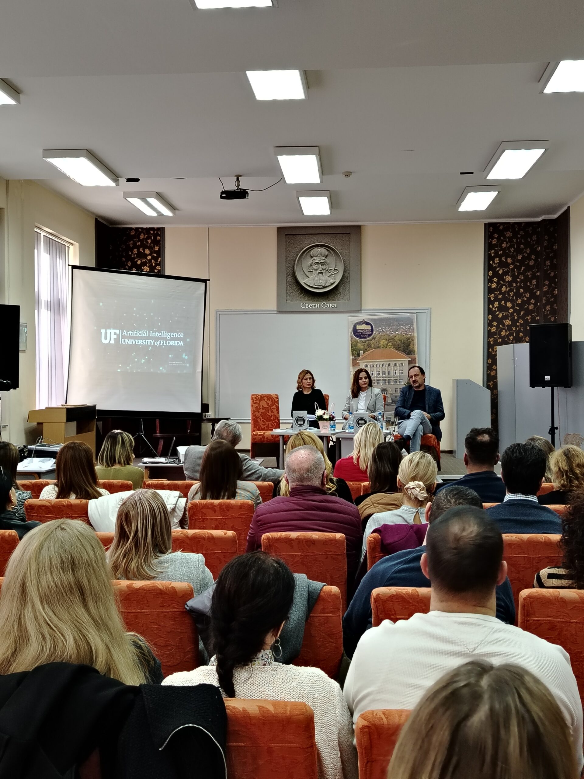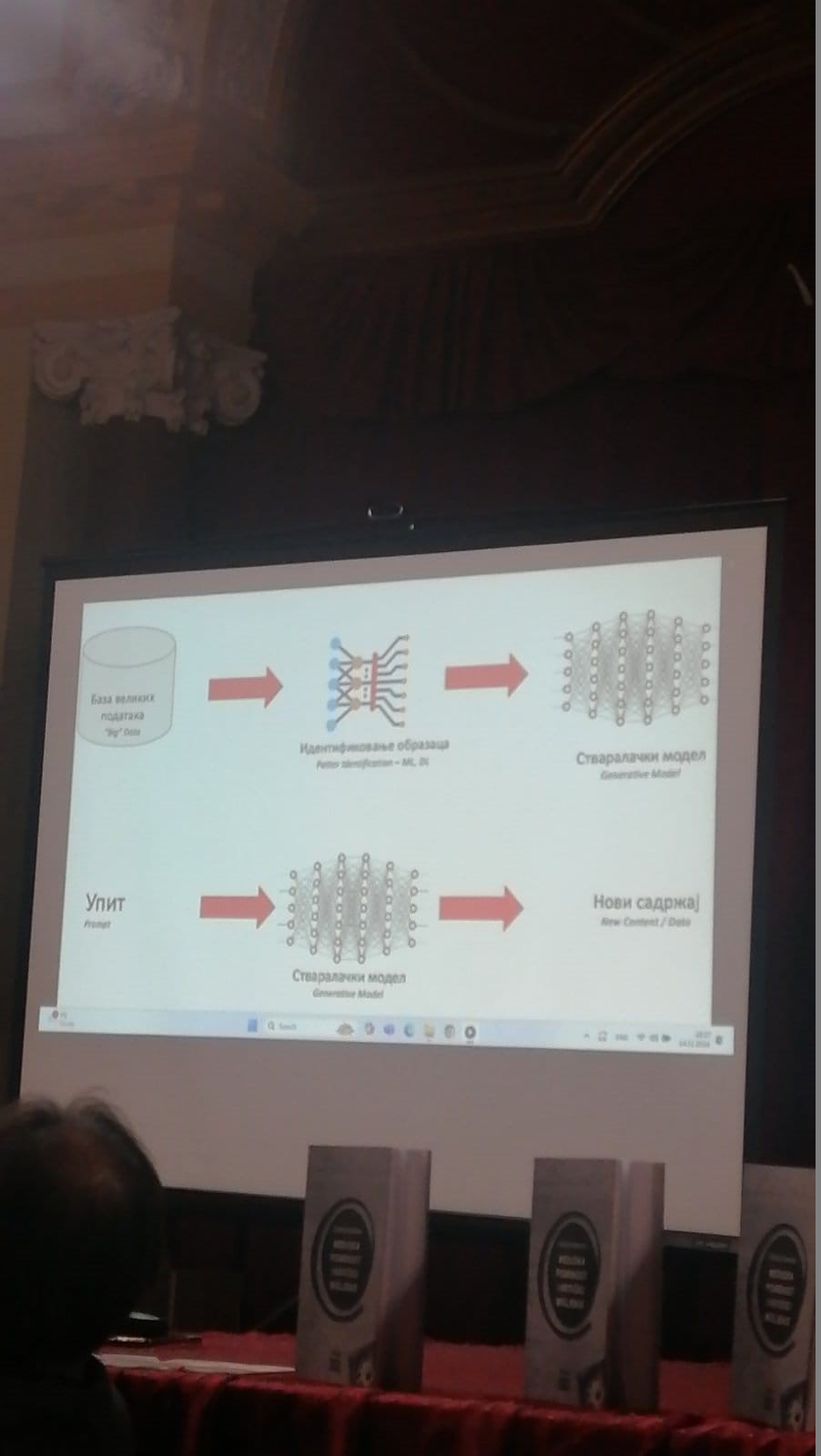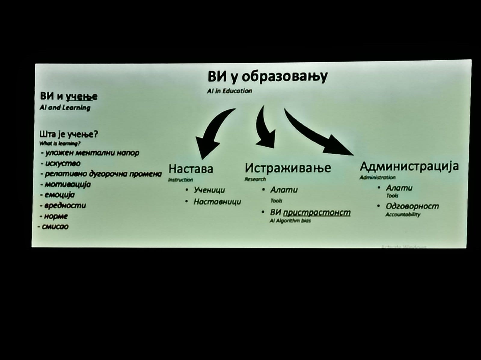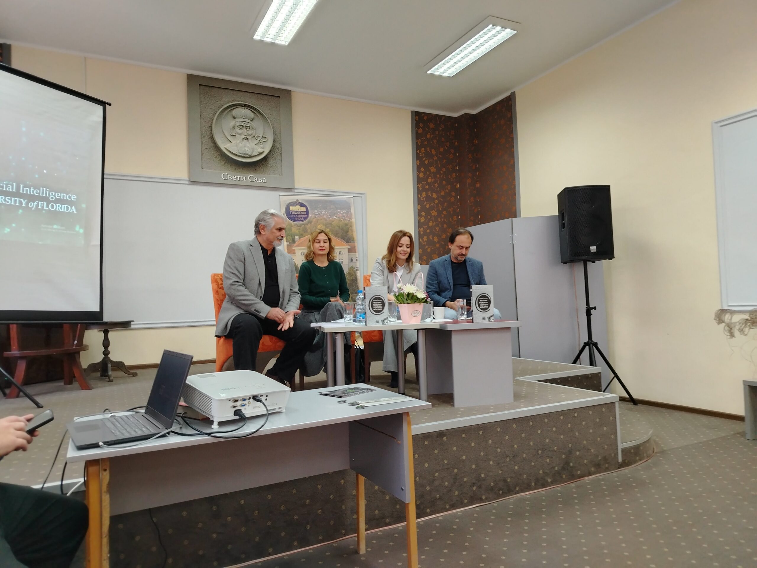 Други део трибине био је посвећен применама вештачке интелигенције у образовању. Добривоје Лале Ерић је у уводу истакао значај образовања за развој нових компетенција и критичког мишљења, као и могућности које AI пружа као алат у свакодневном животу и раду. Бојан је представио конкретне примене AI алата у настави, Тамара је говорила о значају дигиталне писмености за разумевање AI, док је Виолета анализирала утицај вештачке интелигенције на процес учења и персонализацију образовања. Дискусија је обухватила следеће теме: развој критичког мишљења у технолошки доминантном окружењу, оснаживање наставника кроз едукацију и препознавање лажних вести и теорија завере, уз неговање критичког става према информацијама.